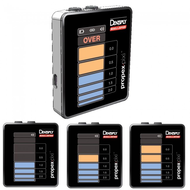 Портативный апекслокатор "Propex Pixi" нового поколения со встроенной многочастотной технологией и функцией апикального увеличения, которая включается при достижении файлом апикальной области, помогая стоматологу локализовать апекс в большинстве корневых каналов. Маленькие габариты позволяют разместить аппарат на груди пациента, имеет цветной дисплей, работает от подзаряжаемого аккумулятора. Звуковая индикация с нарастающим звуком - четыре звуковых уровня.