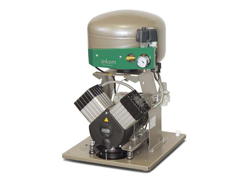 Безмасляный компрессор EKOM является источником чистого, безмасляного сжатого воздуха, предназначенного для приведения в движение зубоврачебных приборов и устройств.  По своим техническим параметрам и размерам резервуара воздуха объемом 25 л, компрессор этого типа может обслуживать два комплекса стоматологических устройств, или оборудования в зуботехнических лабораториях. Сжатый воздух, производимый безмасляным компрессором указанного типа, обеспечивает высокую степень соблюдения гигиены и качества труда стоматолога, не создавая, притом, вокруг себя среду, содержащую чужеродные вещества.