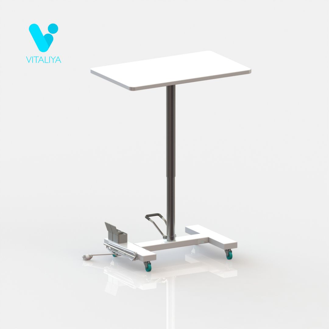 Рабочая поверхность выполнена из постформинга. Регулировка по высоте выполняется за счёт гидравлического подъёмного механизма. На основании стойки расположена одна розетка на два гнезда со шторками. Стойка установлена на колёсные опоры диаметром 50мм, два колеса с тормозом.