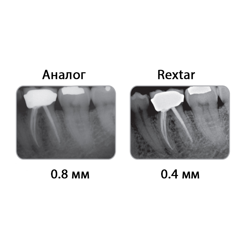 На качество изображения влияет размер фокального пятна, а также угол расхождения лучей, чем они меньше, тем лучше изображение, сфокусированнее. У рентген аппарата REXTAR LCD фокальное пятно равно 0.4 мм, а угол расхождения лучей 12 градусов.