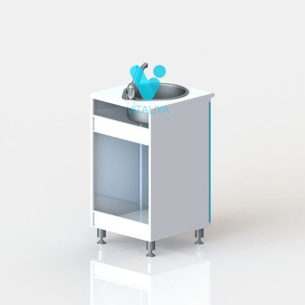 Тумба с дверцей, с вырезом в задней стенке для подвода коммуникаций, оснащена мойкой из нержавеющей стали, локтевым смесителем, сифоном.