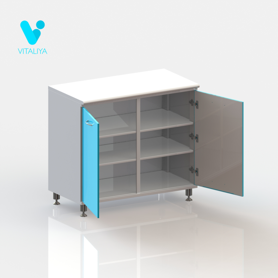 Тумба медицинская М2 на хромированных ножках с полками, двустворчатая металлическая цельносварная