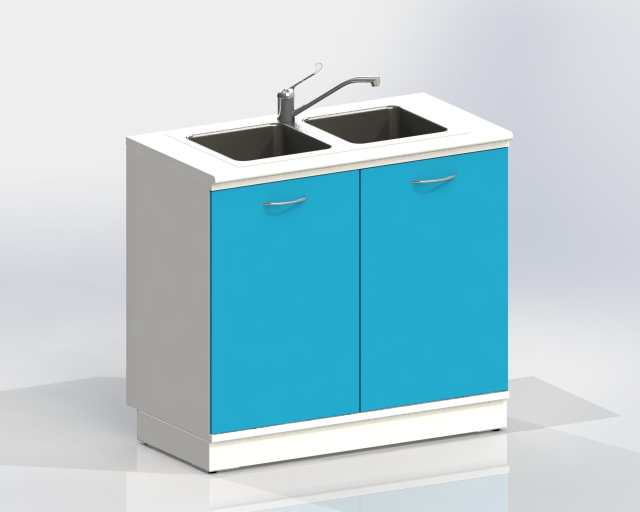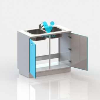 Тумба с двумя дверцами, с вырезом в задней стенке для подвода коммуникаций, оснащена двухчашевой мойкой из нержавеющей стали, локтевым смесителем, сифоном.