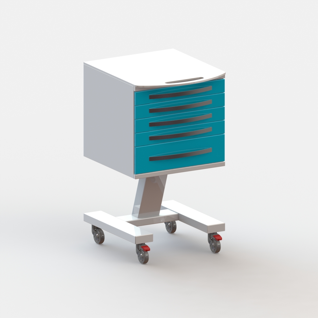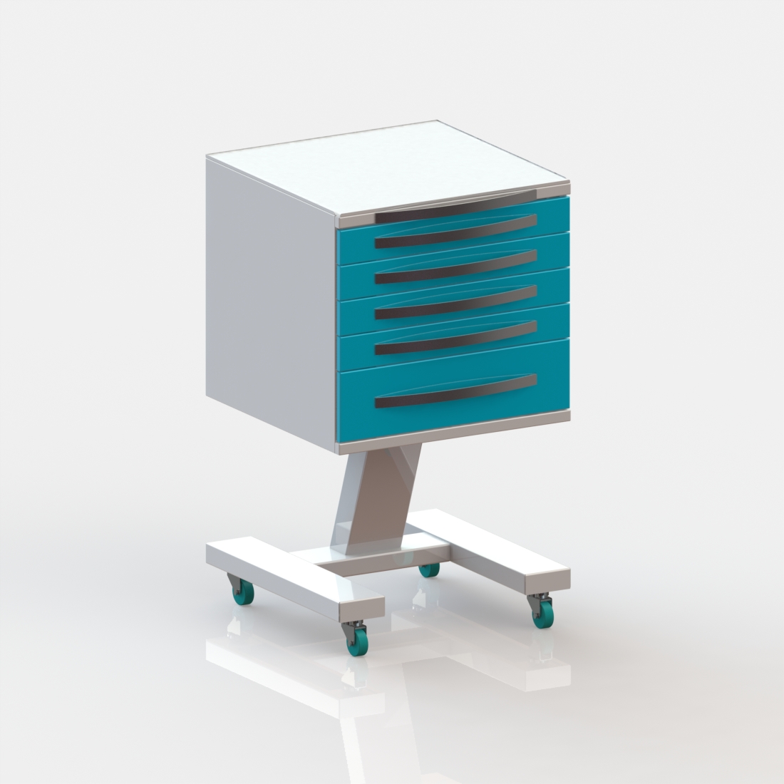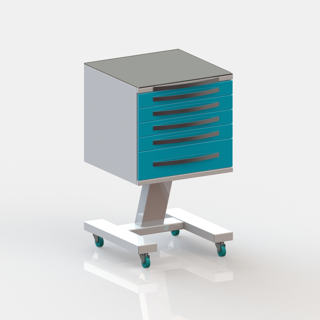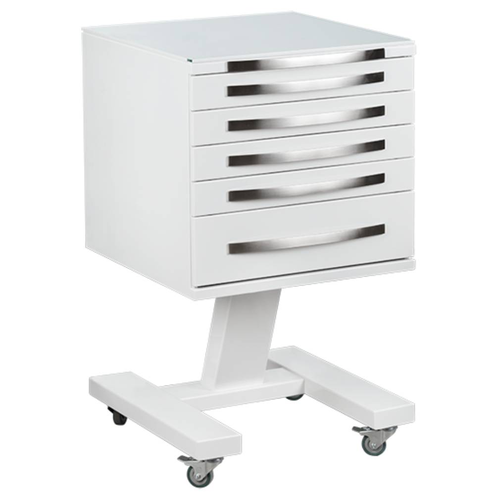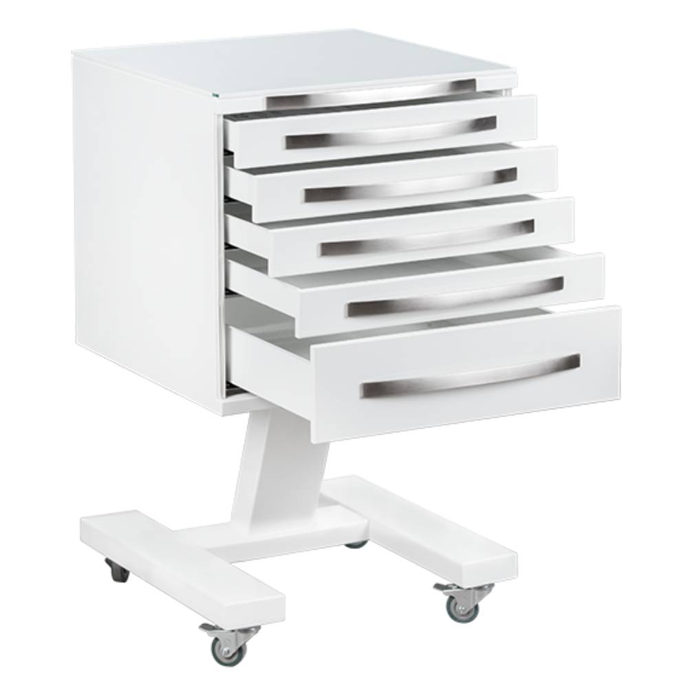 5 выдвижных ящиков. Колёса 50 мм, 2 колеса с тормозом.